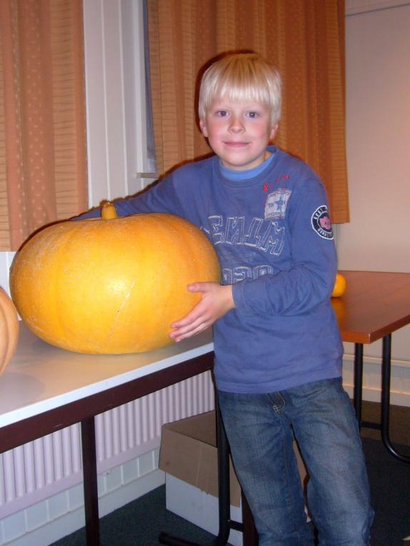 Bernd Terluin bracht vrijdag 26 oktober de zwaarste pompoen mee naar het dorpshuis. Zijn exemplaar woog maar liefst 19,2 kilo. Inger Haanstra had haar pompoen het mooist gemaakt. De pompoenwedstrijd was een inititatief van de feestcommissie. Dit voorjaar kregen de basisschoolleerlingen zaadjes en konden ze hun pompoenen opkweken. Vrijdag werd de oogst gekeurd en gewogen in het dorpshuis tijdens een ´Halloweenparty´. Peek Bonebakker en Tjitske Gaastra zochten de mooiste pompoen uit. Inger Haanstra won het daarbij nipt van Michiel Hettinga. Voor de selectie van de zwaarste pompoen was geen weegschaal nodig: die van Bernd was duidelijk de grootste. De tweede plaats was voor Tymen en Elbrich Schraa (14,9 kilo) en de derde plaats voor Anke Fekken (11,2 kilo).