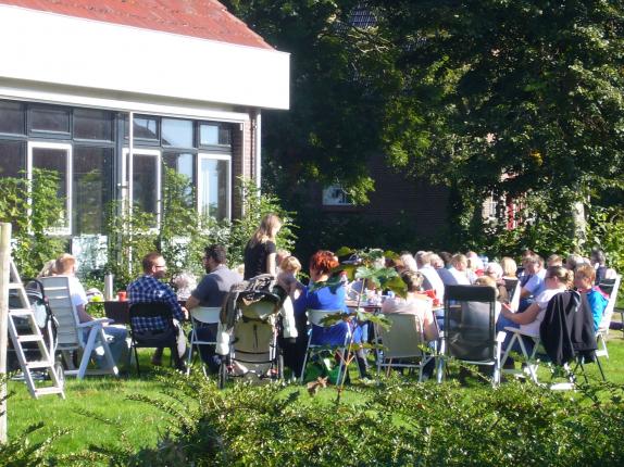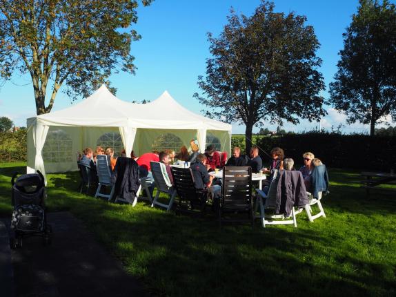 Zaterdagochtend 26 september was het weer samen als buurt op de koffie in het kader van Nationale Burendag. Dit jaar al weer voor de zesde keer kwamen de bewoners van het "streekje" Brânburren" en de omliggende woningen aan de Heidenskipsterdyk samen voor ontmoeting op het grasveldje van de voormalige basischool 'de Brège' onder het genot van een lekker bakkie en zelfgebakken koek! Ook elders in It Heidenskp zaten groepjes bewoners bij elkaar onder een stralende hemel. Zo ook de bewoners van de Koaidyk en het Helspaad. Zij zaten gezellig aan de koffie met eigengemaakt gebak naast de partytent die bij een van hen was opgezet.