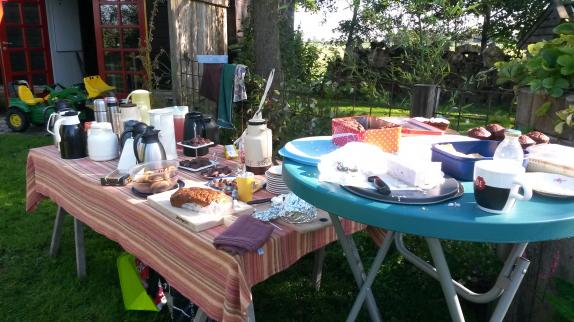 It Heidenskip ging op de Burendag massaal bij elkaar op de koffie. Op deze stralende zaterdagochtend konden ze bijpraten en genieten van elkaars koffie en lekkernijen. De Buert zat traditiegetrouw op het voormalige 'schoolplein' en de 'Workumer kant' van de Heidenskipsterdyk en de Ursuladyk hadden een 'noflike kofjemoarn' in de tuin van de familie Zeinstra. Hier leek het wel 'Heel Heidenskip Bakt'. De 'Koudumer kant' zat bij de familie Van der Heide en hadden zelfs muzikale begeleiding van Feiko Pijst. De Koaidyk en Helspaad zaten bij Klaas en Betty en daar was het zo gezellig, dat ze zijn vergeten foto's te maken.