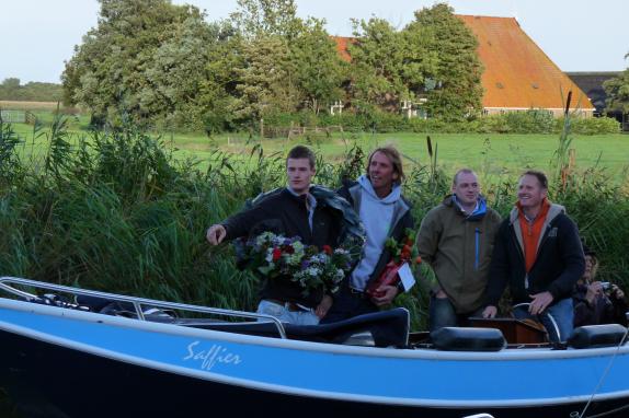 Beide kampioenen werden op gepaste wijze - over het water - binnengehaald onder muzikale klanken van Studio.