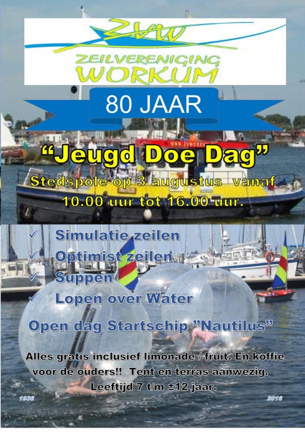 Zeilvereniging Workum bestaat dit jaar 80 jaar en is derhalve al sinds 1936 actief in de watersport. Van de verenigingscompetitie op 't Gaastmeer tot het mega-event de Dutch Youth Regatta met deelname uit 28 landen en zo'n 800 deelnemers, het grootste van Europa op buitenwater. Maar ook het skûtsjesilen onder auspiciën van de IFKS behoort tot de evenementen waarbij onze zeilvereniginghaar mannetje staat. Dit is natuurlijk alleen haalbaar als je een groep gemotiveerde vrijwilligers hebt om met weer en wind het water op te gaan en de wedestrijden in goede banen te leiden. Sinds een aantal jaren hebben we de draad weer opgepakt met het jeugdzeilen, waarbij de kinderen les krijgen in de Optimist, en sinds kort zijn we ook de gelukkige eigenaar van twee Laser Pico's, zodat ook de al wat gevorderde zeiler uit de voeten kan. Daarom houdt de jeugdafdeling van zeilvereniging Workum op woensdag 3 augustus tijdens de markt Zo Lang als Workum op de Stedspôle van 10.00 uur tot 16.00 uur een Jeugd Doe Dag!